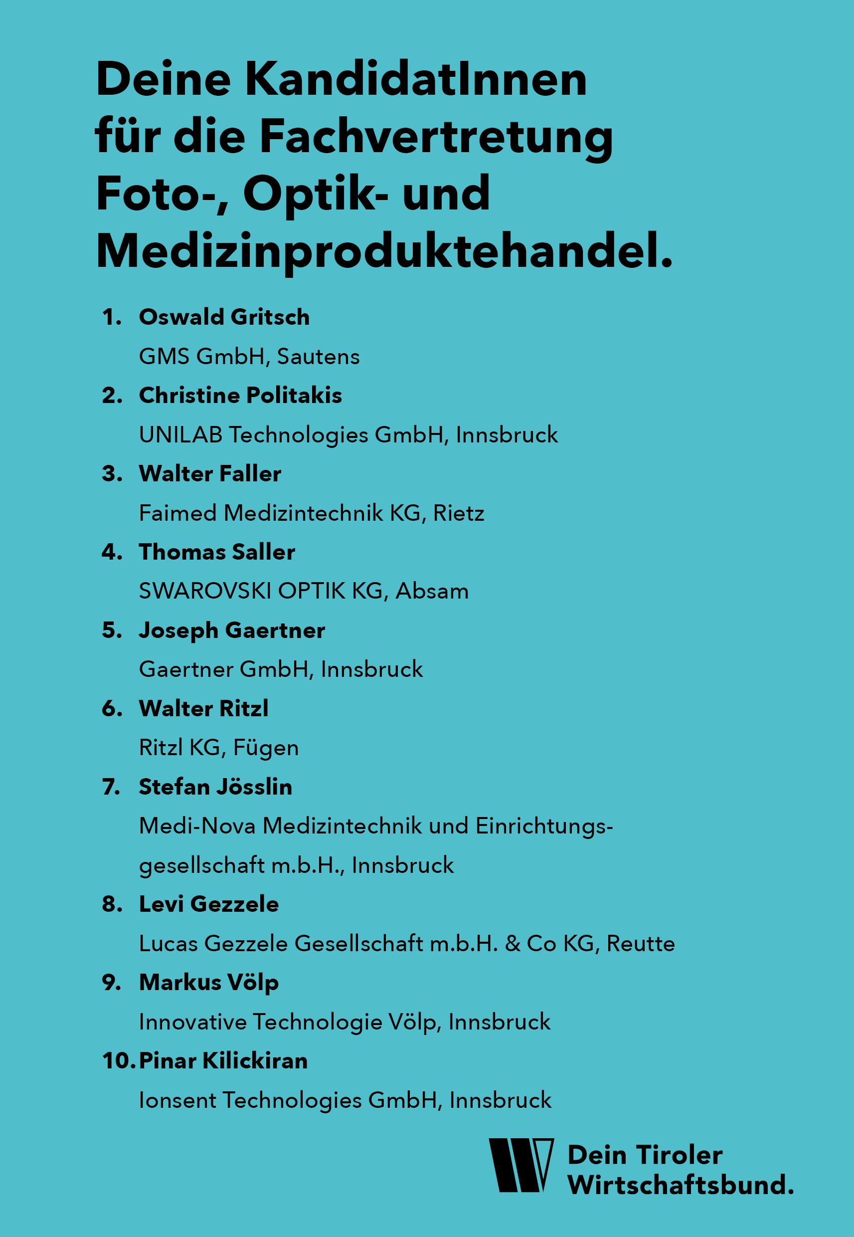 „Erfahrung aus der Praxis, Verhandlungskraft für die Wirtschaft: Unsere KandidatInnen der Fachvertretung Foto-, Optik- und Medizinproduktehandel mit Spitzenkandidat Oswald Gritsch sind UnternehmerInnen wie Du und setzen sich tagtäglich für Dich und Deine Branche ein..“