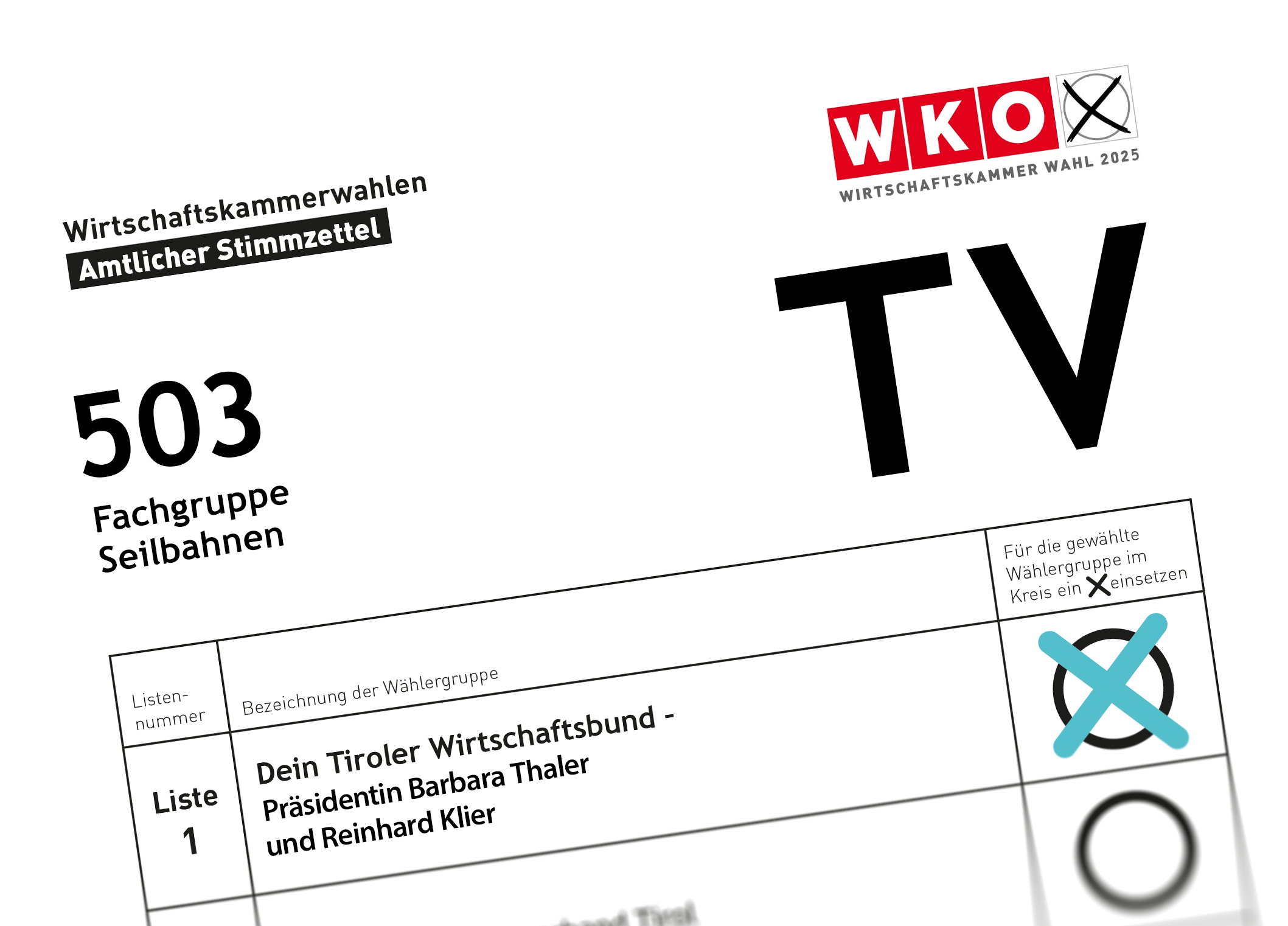 Hinweis: Laut Verlautbarung der Hauptwahlkommission der Wirtschaftskammer Tirol vom 4. Februar 2025 wurde in dieser Fachorganisation nur der Wahlvorschlag des Tiroler Wirtschaftsbundes eingebracht. Daher findet keine Wahl statt, und die BewerberInnen gelten mit dem Wahltag als gewählt.